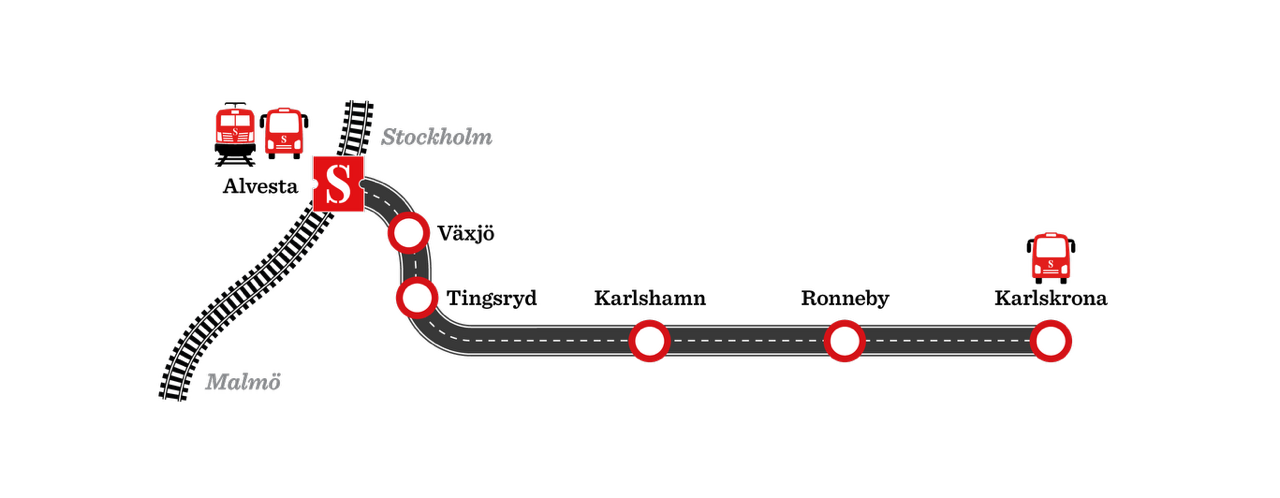 Med Snälltågets anslutande buss reser du smidigt mellan Karlskrona och Alvesta. Bussen stannar även i Ronneby, Karlshamn, Tingsryd och Växjö. Här hittar du information om hållplatser för den anslutande bussen.